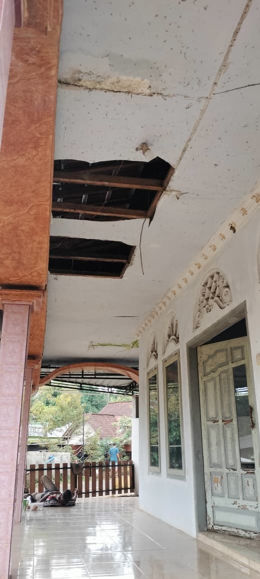 Kondisi paling mengkhawatirkan berada di bagian teras. Lubang besar pada plafon mengintai setiap jamaah yang datang. Potongan plafon bisa jatuh kapan saja, membahayakan anak-anak, orang tua, dan seluruh warga yang tetap setia datang untuk beribadah.