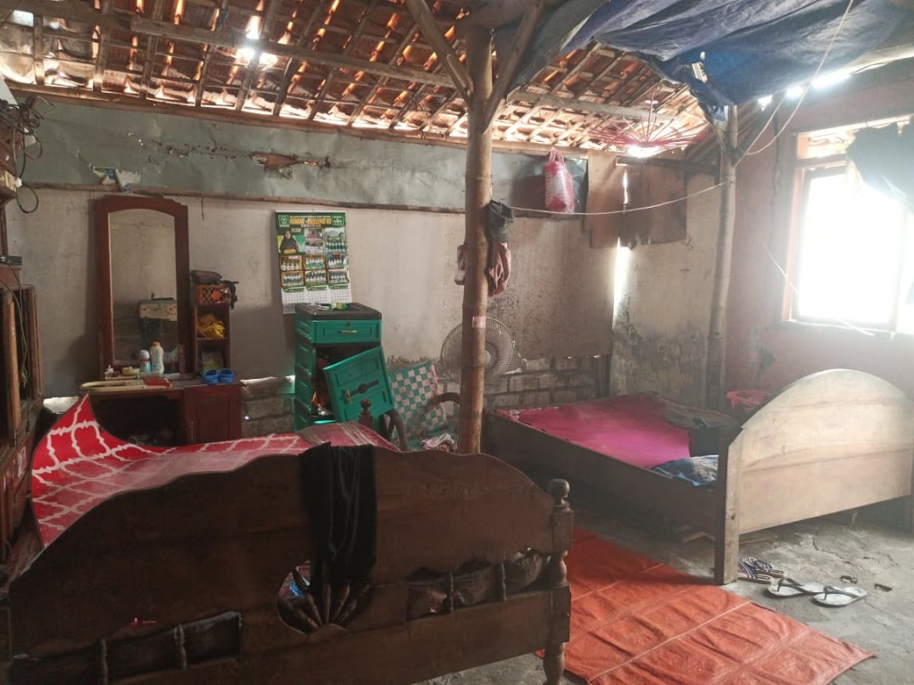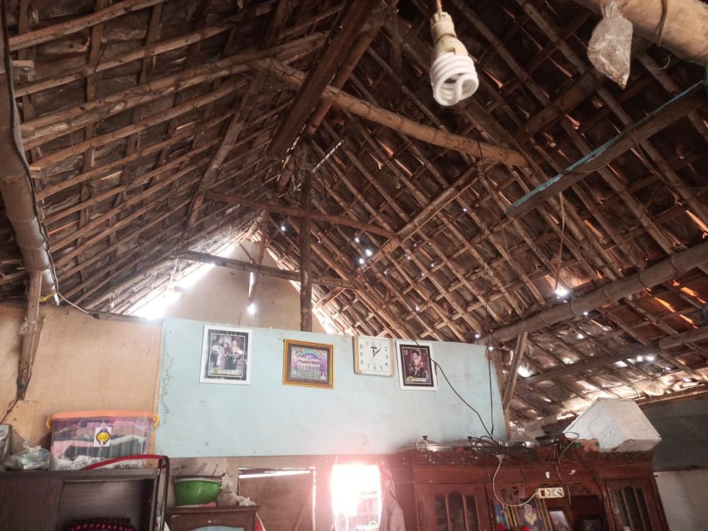 atap bocor di banyak bagian, dinding bambu yang rapuh dimakan usia, dan lantai tanah yang becek setiap kali hujan datang.